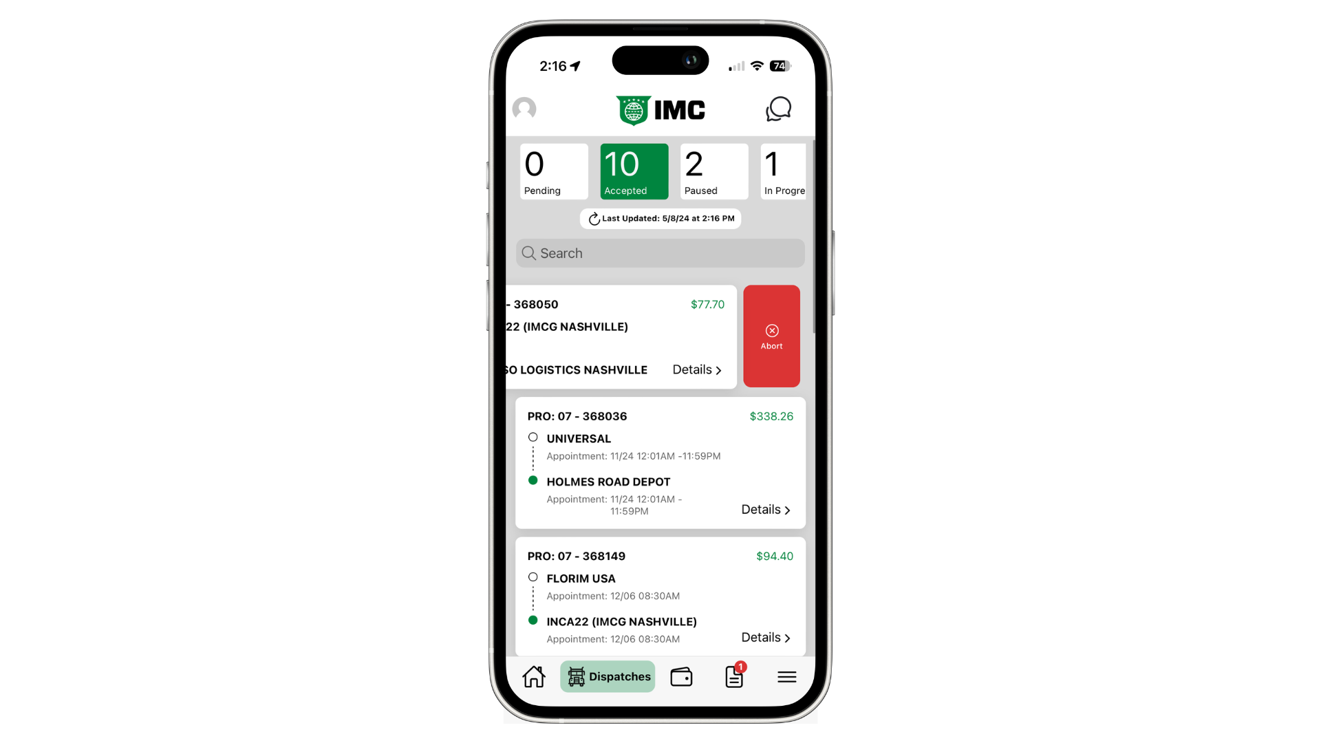 To reveal the Abort button, navigate to the Dispatch List and find the dispatch you need to cancel. Slide the card to the left to show the red Abort button and tap it. Doing this will remove the dispatch from your app.