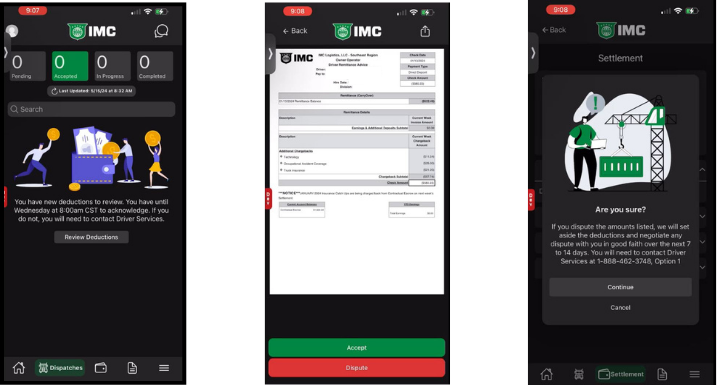 Drivers can acknowledge these deductions by navigating to the Settlement screen, typing in their PIN, and tapping on “Deductions for Review.”