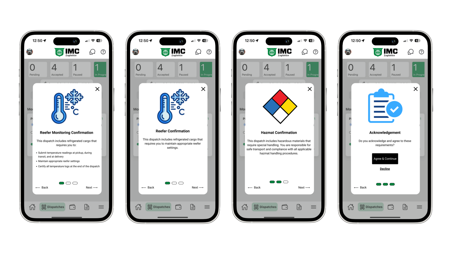 Al iniciar un despacho que incluye Reefer, GXP Reefer, o Hazmat, los conductores ahora verán una ventana de confirmación antes de comenzar el viaje. Estas ventanas están diseñadas para asegurar que los conductores entiendan las expectativas para cargas especializadas antes de salir.